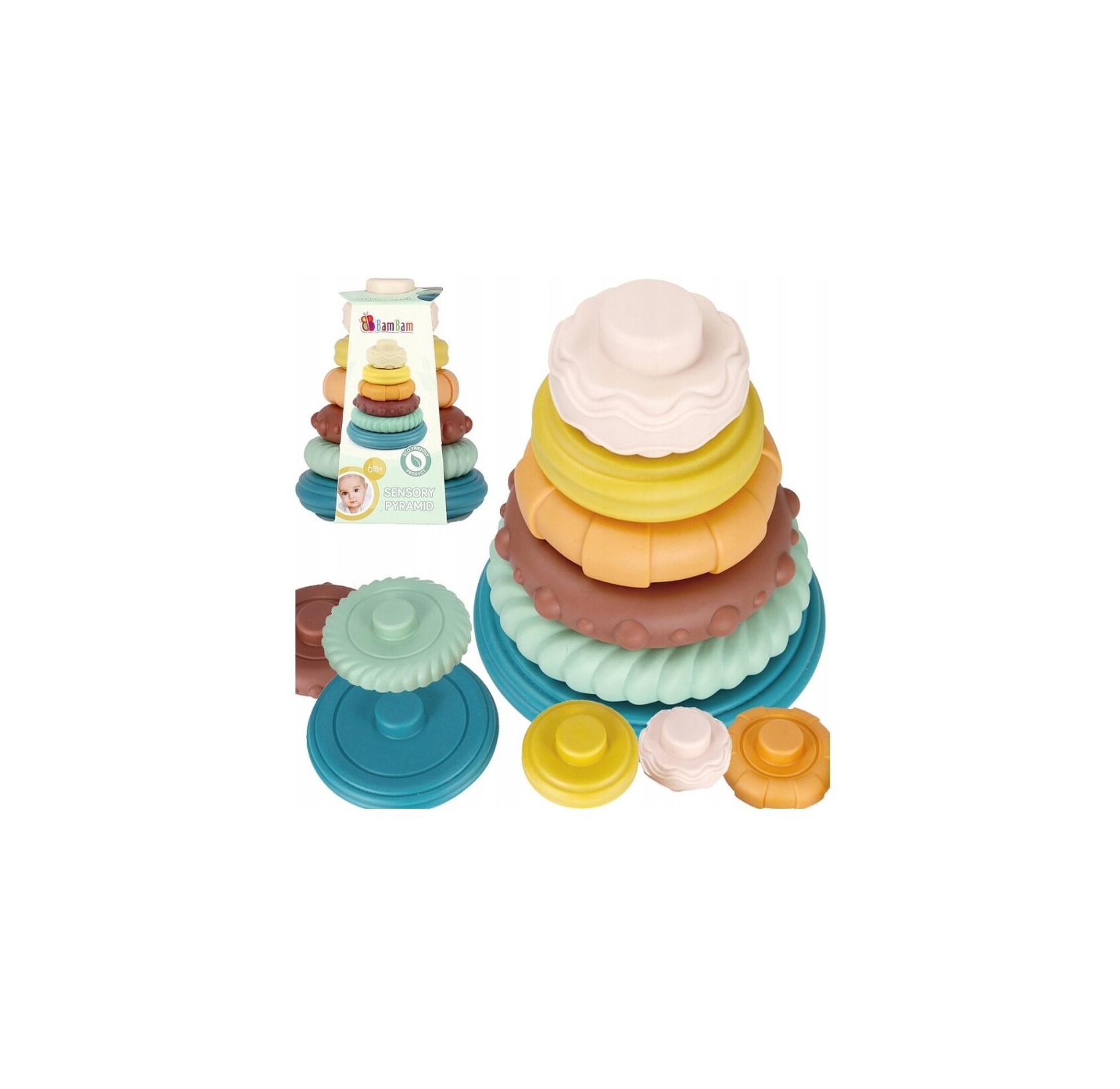 SENSORY PYRAMID: Οι ΔΑΚΤΥΛΙΟΙ ΤΗΣ ΕΚΠΑΙΔΕΥΤΙΚΗΣ ΠΑΣΤΕΛ ΠΥΡΑΜΙΔΑΣ είναι ιδανικοί για την πρώτη περίοδο εκμάθησης ταξινόμησης και εξάσκησης κινητικών δεξιοτήτων. Ο πύργος στοίβαξης αποτελείται από 6 ΔΑΚΤΥΛΙΟΥΣ διαφορετικών μεγεθών και χρωμάτων. Κάθε κομμάτι έχει τα δικά του μοναδικά χαρακτηριστικά εμφάνισης που ενθαρρύνουν τη μεγάλη διασκέδαση. Όλα τα στοιχεία της εκπαιδευτικής πυραμίδας διαθέτουν φιλικά για τα μάτια χρώματα, εισάγοντάς τα μωρά στον κόσμο των χρωμάτων και εμπλουτίζοντας την οπτική τους εμπειρία. Επιπλέον, χαρακτηρίζονται από διάφορα ενδιαφέροντα σχήματα, τα οποία επιτρέπουν στα μωρά να έχουν μια ποικιλία αισθητηριακών εμπειριών. Το μωρό μπορεί να παρακολουθήσει, να αγγίξει και να οργανώσει την πυραμίδα του. Αυτή η ενασχόληση βοηθά στην ανάπτυξη του συντονισμού χεριού-ματιού και των κινητικών δεξιοτήτων. Το παιχνίδι έχει θετική επίδραση στη σωστή ανάπτυξη του παιδιού διεγείροντας την αίσθηση της όρασης και της αφής, η οποία είναι ζωτικής σημασίας στη διαδικασία μάθησης και γνωριμίας με τον περιβάλλοντα κόσμο. Τα παστέλ χρώματα διεγείρουν την αίσθηση της όρασης και της αντίληψης, το παιχνίδι αναπτύσσει τέλεια τη φαντασία και τις γνωστικές δεξιότητες. Η πυραμίδα έχει σχεδιαστεί για παιδιά ηλικίας 6μ+.
