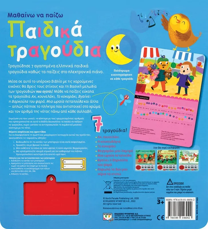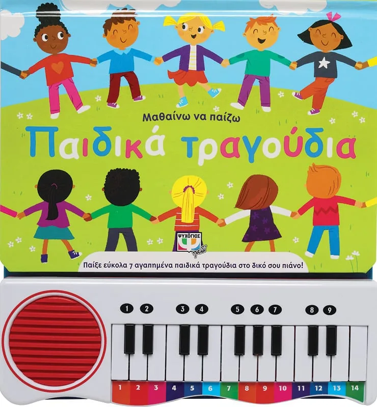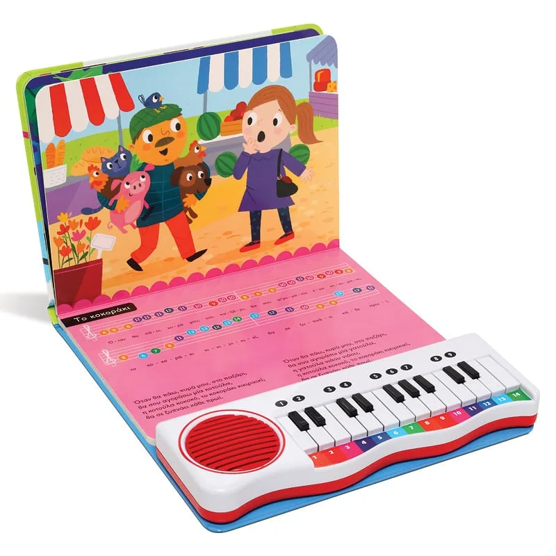 Τραγούδησε 7 αγαπηµένα ελληνικά παιδικά τραγούδια καθώς τα παίζεις στο ηλεκτρονικό πιάνο. Μέσα σε αυτό το υπέροχο βιβλίο µε τις χαρούµενες εικόνες θα βρεις τους στίχους και τη βασική µελωδία των τραγουδιών που αγαπάς! Μάθε να παίζεις εύκολα τα τραγούδια Αχ, κουνελάκι, Το κοκοράκι, Βγαίνει η βαρκούλα του ψαρά, Μια ωραία πεταλούδα και άλλα– απλώς πάτησε το πλήκτρο που αντιστοιχεί στο χρώµα και τον αριθµό της νότας πάνω από κάθε συλλαβή