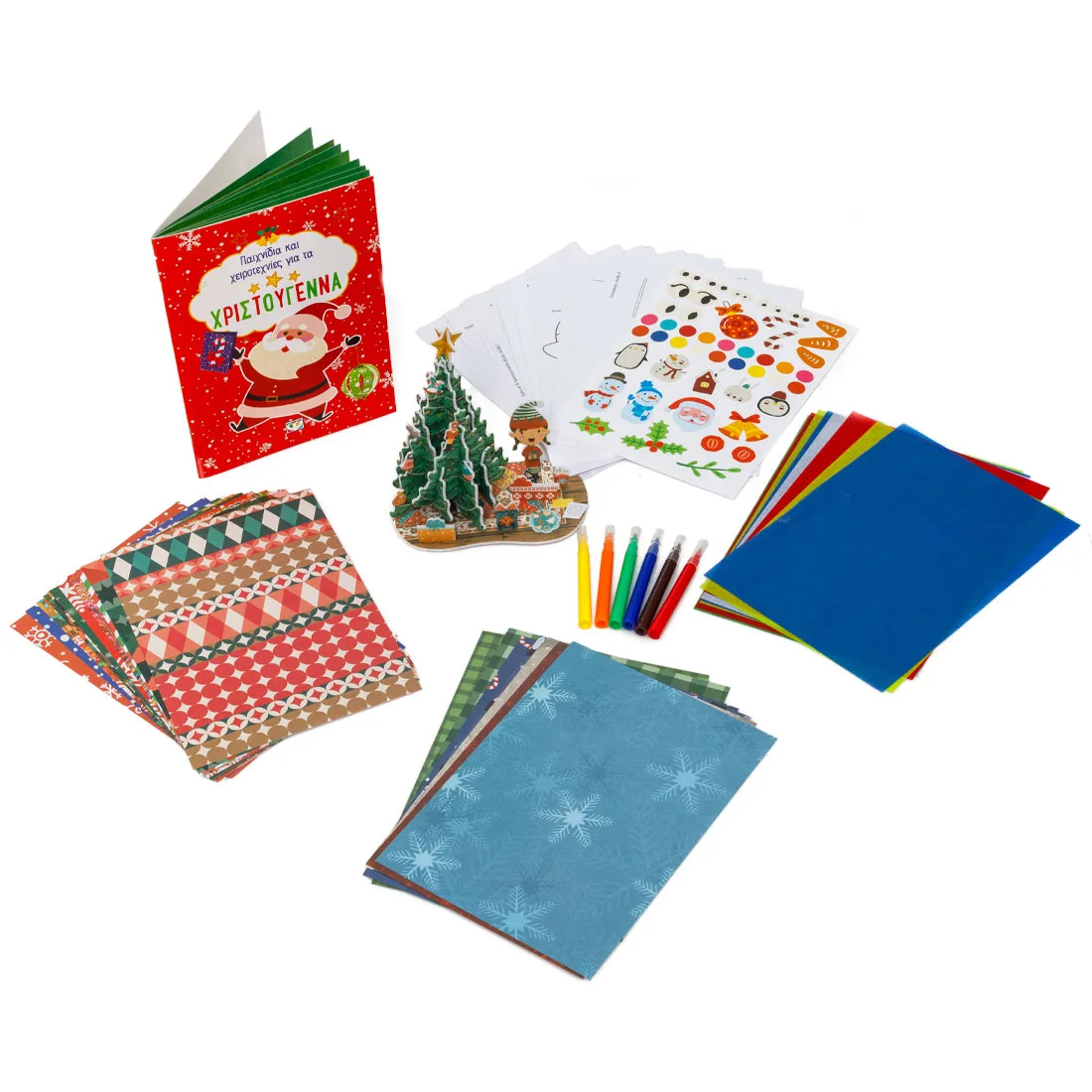 Φτιάξε εντυπωσιακές γιορτινές κατασκευές! Σε αυτό το βαλιτσάκι θα βρεις ένα καταπληκτικό βιβλίο με εύκολες οδηγίες για να φτιάξεις υπέροχες κατασκευές, 20 φύλλα χρωματιστό χαρτί, πατρόν, αυτοκόλλητα, μαρκαδοράκια και χαρτί αφής, αλλά και μια πρωτότυπη τρισδιάστατη μακέτα!