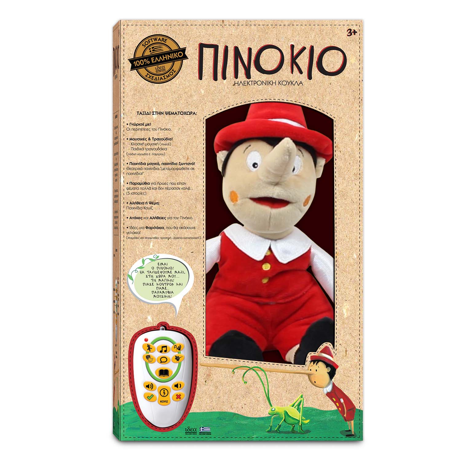 Μηχανική λούτρινη κούκλα Πινόκιο με κίνηση στο στόμα του και στο σώμα. Λέει παραμύθια, αστείες ατάκες, την ιστορία του, παιχνίδια κουίζ!