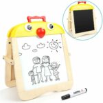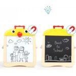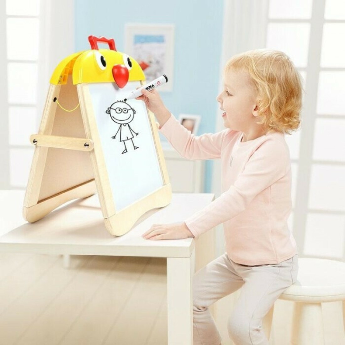 Πίνακας ζωγραφικής διπλής όψης που έχει τη μορφή ενός χαριτωμένου κοτόπουλου, ενώ το φωτεινό κίτρινο χρώμα θα τραβήξει την προσοχή του παιδιού σας. Στη μία πλευρά έχει έναν ασπροπίνακα και στην άλλη έναν μαυροπίνακα. Ο πίνακας είναι μαγνητικός. Το στόμα του κοτόπουλου αποσπάται και γίνεται σφουγγάρι. Ο πίνακας κλείνει και μεταφέρεται πανεύκολα.