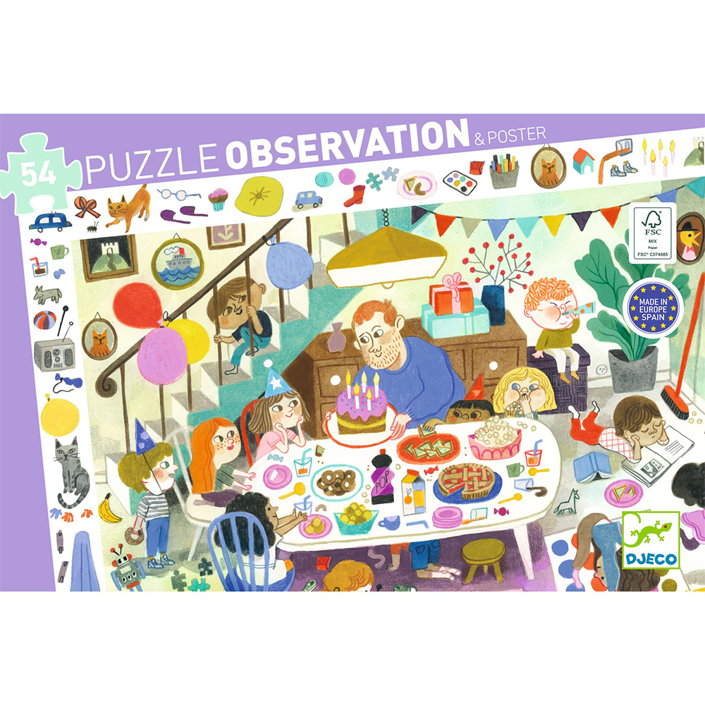 Μη χάσετε το πάρτι γενεθλίων της Τζένης με αυτό το παζλ παρατήρησης 54 κομματιών της εταρείας Djeco! Ιδανικό για ηλικίες 4 ετών και άνω, το συναρπαστικό αυτό παζλ τους επιτρέπει να ανακαλύψουν κρυμμένες εκπλήξεις σε μια πανέμορφη εικονογραφημένη σκηνή. Όταν ολοκληρωθεί το παζλ, η πραγματική διασκέδαση ξεκινά καθώς τα παιδιά ψάχνουν τα στοιχεία που εμφανίζονται στο περιθώριο και είναι κρυμμένα μέσα στην εικόνα. Ένα τέλειος συνδυασμός ανάπτυξης δεξιοτήτων παρατήρησης & σύνθεσης.