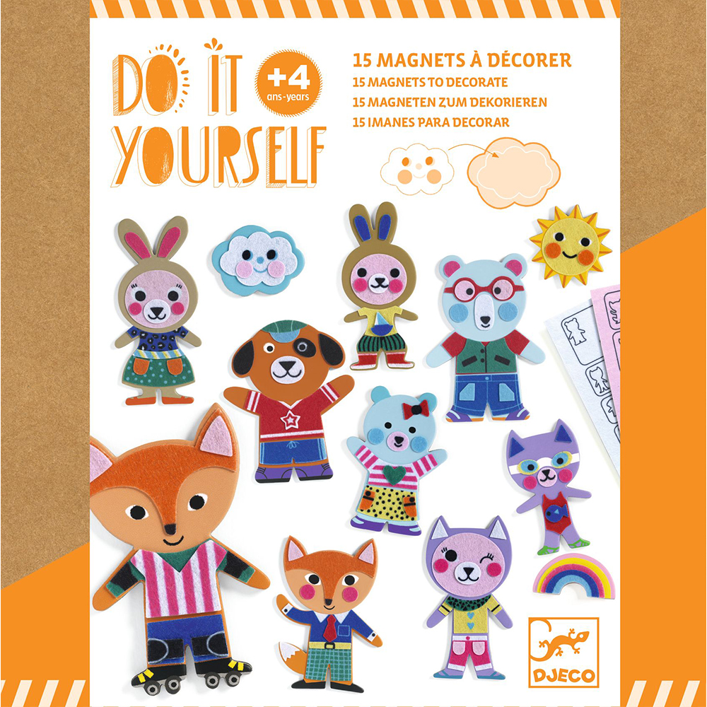 Κατασκευάστε μια σειρά από χαρούμενα μαγνητάκια – ζωάκια, κολλώντας τσόχινα αυτοκόλλητα τα ένα πάνω από το άλλο! Τα παιδιά ντύνουν τα ζωάκια με ρούχα και αξεσουάρ, στολίζοντας τα με μαλακά αυτοκόλλητα. Με αυτόν το τρόπο, θα κατασκευάσουν 15 μεγάλα μαγνητάκια μεγέθους 12,5 εκατοστών, που μπορούν κολλήσουν πάνω στο ψυγείο ή σε μαγνητικό πίνακα, για να συνεχιστεί το παιχνίδι εκεί! Μια πρωτότυπη χειροτεχνία της σειράς Do It Yourself της εταιρίας Djeco, που εμπνέει τα παιδιά να αφήσουν τη φαντασία τους ελεύθερη και να κατασκευάσουν κάτι που θα το χρησιμοποιήσουν και για το οποίο θα είναι περήφανοι, αποκτώντας περισσότερη αυτοπεποίθηση. Η δραστηριότητα αυτή εισάγει τα παιδιά στην έννοια της ακολουθίας και αναπτύσσει τη συγκέντρωση, την υπομονή, τη δημιουργικότητα και τη λεπτή κινητικότητα τους. Το παιχνίδι περιλαμβάνει 15 μαγνητάκια, 8 φύλλα με τσόχινα αυτοκόλλητα και εικονογραφημένες οδηγίες.