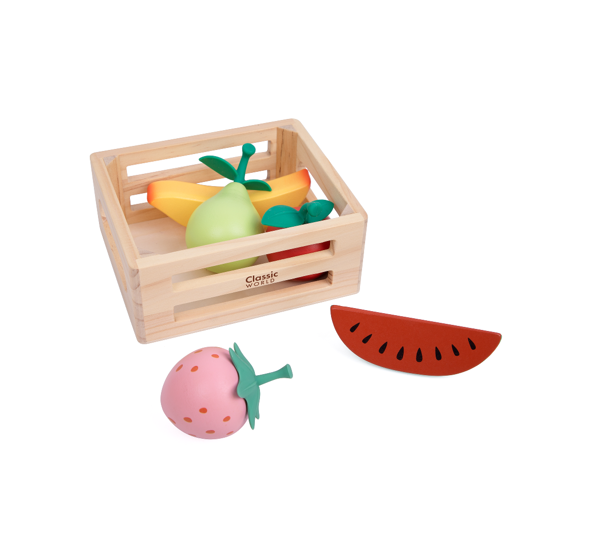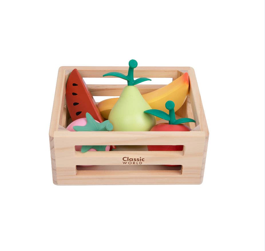 Αυτό το σετ με τα φρούτα βοηθάει τα παιδιά να αναγνωρίζουν διαφορετικά χρώματα και φρούτα ενώ παίζουν και να ενισχύσουν τις γνωστικές τους δεξιότητες. Τα παιδιά μπορούν να αποθηκεύσουν τα φρούτα στο ξύλινο καλαθάκι στο τέλος του παιχνιδιού για να αναπτύξουν τη συνήθεια της αποθήκευσης.
