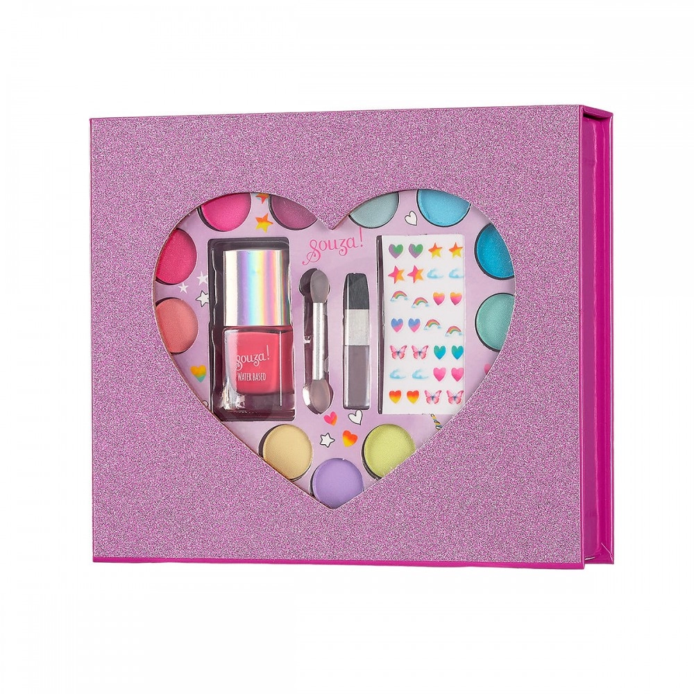 Σετ ομορφιάς σε κουτί δώρου διακοσμημένο με καρδιά. Το σετ περιλαμβάνει 11 σκιές ματιών, 1 βερνίκι νυχιών, 1 φύλλο με 28 διακοσμητικά αυτοκόλλητα νυχιών, 1 βουρτσάκι και 1 πινελάκι. Όλα τα καλλυντικά της εταιρείας Souza είναι vegan, δερματολογικά ελεγμένα και έχουν βάση το νερό ώστε να είναι φιλικά προς το περιβάλλον και το παιδί.