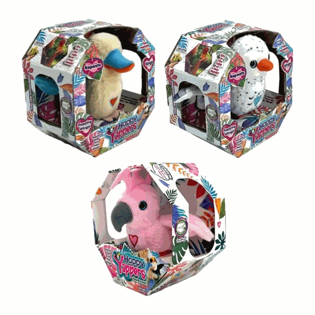 Φέρτε χαρά, γέλιο και πολύ κελάηδημα στο σπίτι σας με τα Happy Yappers, το αξιολάτρευτο δίδυμο πουλιών που λατρεύουν να συζητούν, να τραγουδούν και να κουνάνε τα φτερά τους! Αλλά η διασκέδαση δεν σταματά εδώ, τα Happy Yappers μπορούν να μιλήσουν μεταξύ τους! Δείτε τα να τραγουδούν συγχρονισμένα, να μιμούνται τα λόγια σας και να αλληλεπιδρούν με τον πιο γοητευτικό τρόπο. Με ζωντανούς ήχους πουλιών, φτερουγίσματα και ενσωματωμένες επαναφορτιζόμενες μπαταρίες (περιλαμβάνεται καλώδιο USB), είναι ο τέλειος συνδυασμός . Τα Happy Yappers είναι οι νέοι αγαπημένοι σας φτερωτοί φίλοι, πάντα έτοιμοι για κουβέντα!