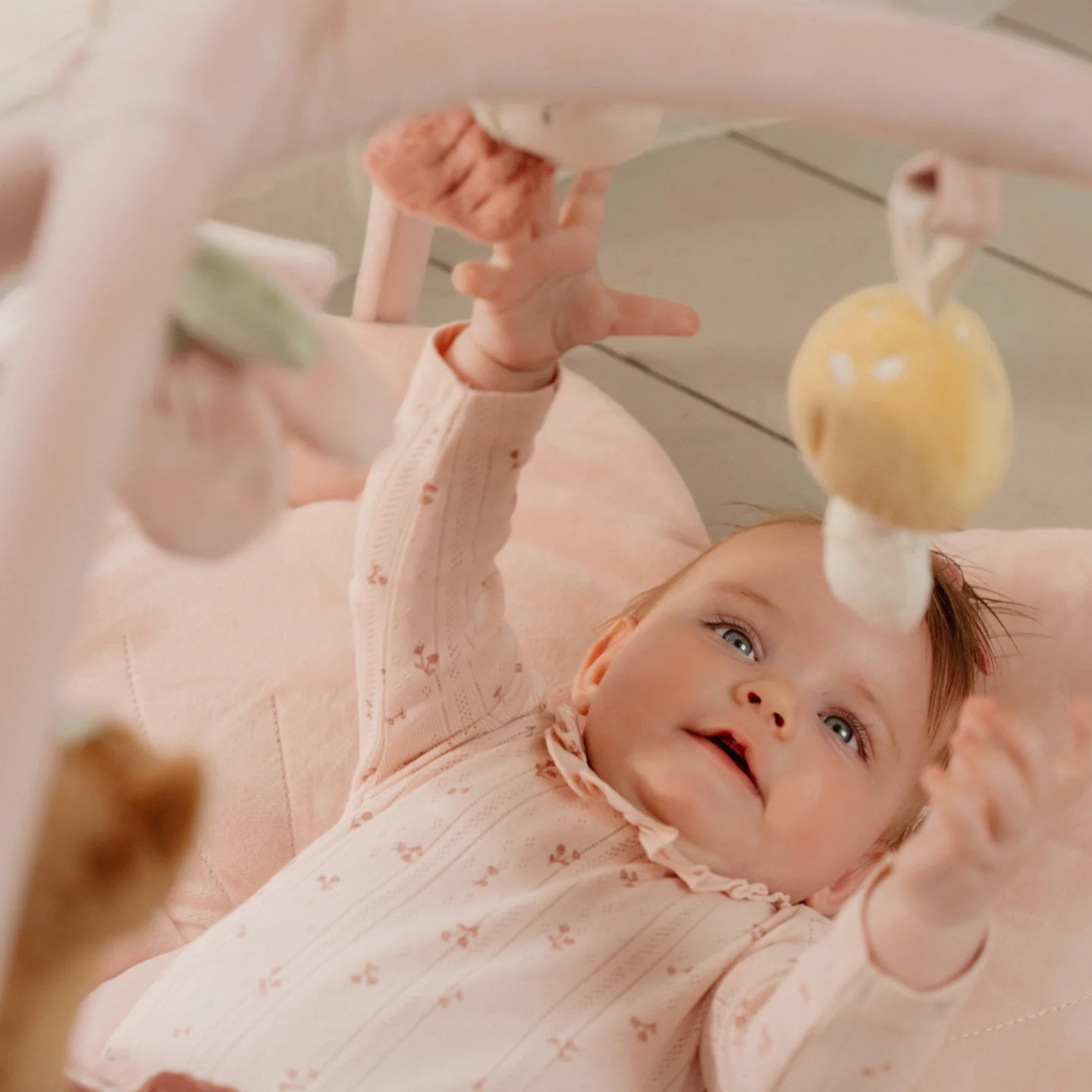 Κάθε μέρα γίνεται μια περιπέτεια με αυτό το μαγικό γυμναστήριο δραστηριοτήτων σε σχήμα λουλουδιού. Σε απαλό ροζ χρώμα, διαθέτει δύο άνετους βελούδινους θόλους με πέντε χαριτωμένα κρεμαστά παιχνίδια από τη συλλογή Fairy Garden.