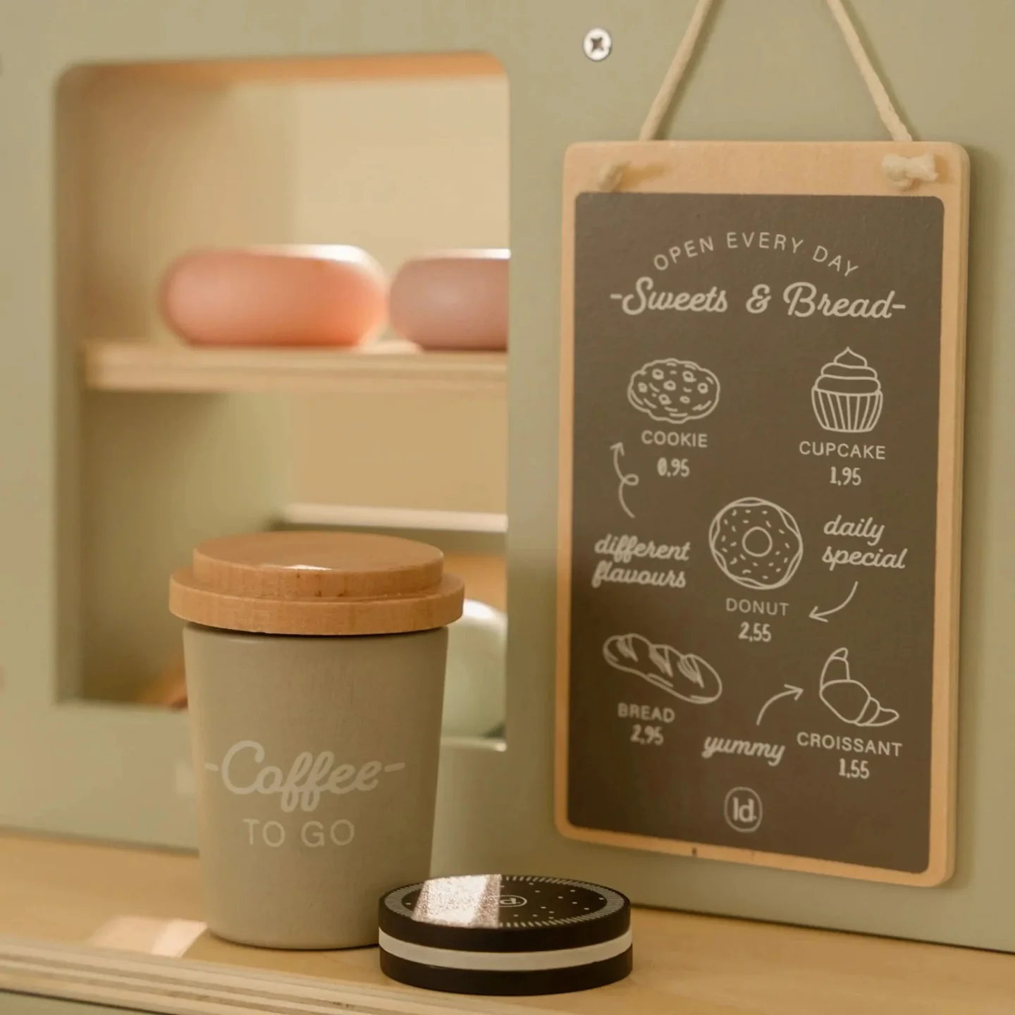Το σετ περιλαμβάνει μηχανή καφέ και τσαγιού, αποθηκευτικό χώρο για φλιτζάνια και ντουλάπι για να εκθέτουν τα λαχταριστά σάντουιτς και γλυκάκια.