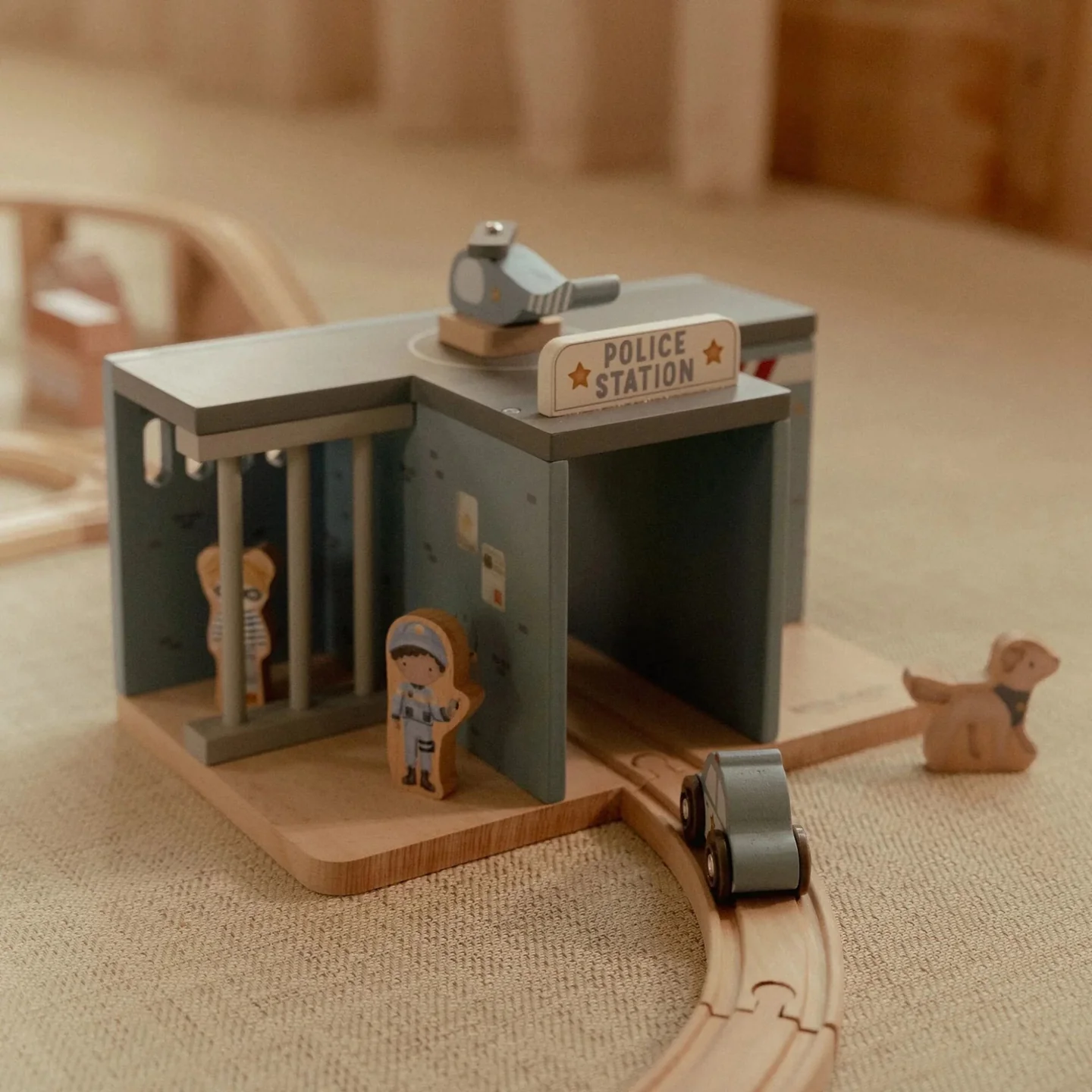 Αυτό το ξύλινο αστυνομικό τμήμα είναι πλήρως εξοπλισμένο για συναρπαστικές περιπέτειες, με περιπολικό, ελικόπτερο, γενναίο αστυνομικό, πονηρό κλέφτη και έναν πιστό αστυνομικό σκύλο. Ο σταθμός διαθέτει κελί με κάγκελα και ελικοδρόμιο στην ταράτσα.