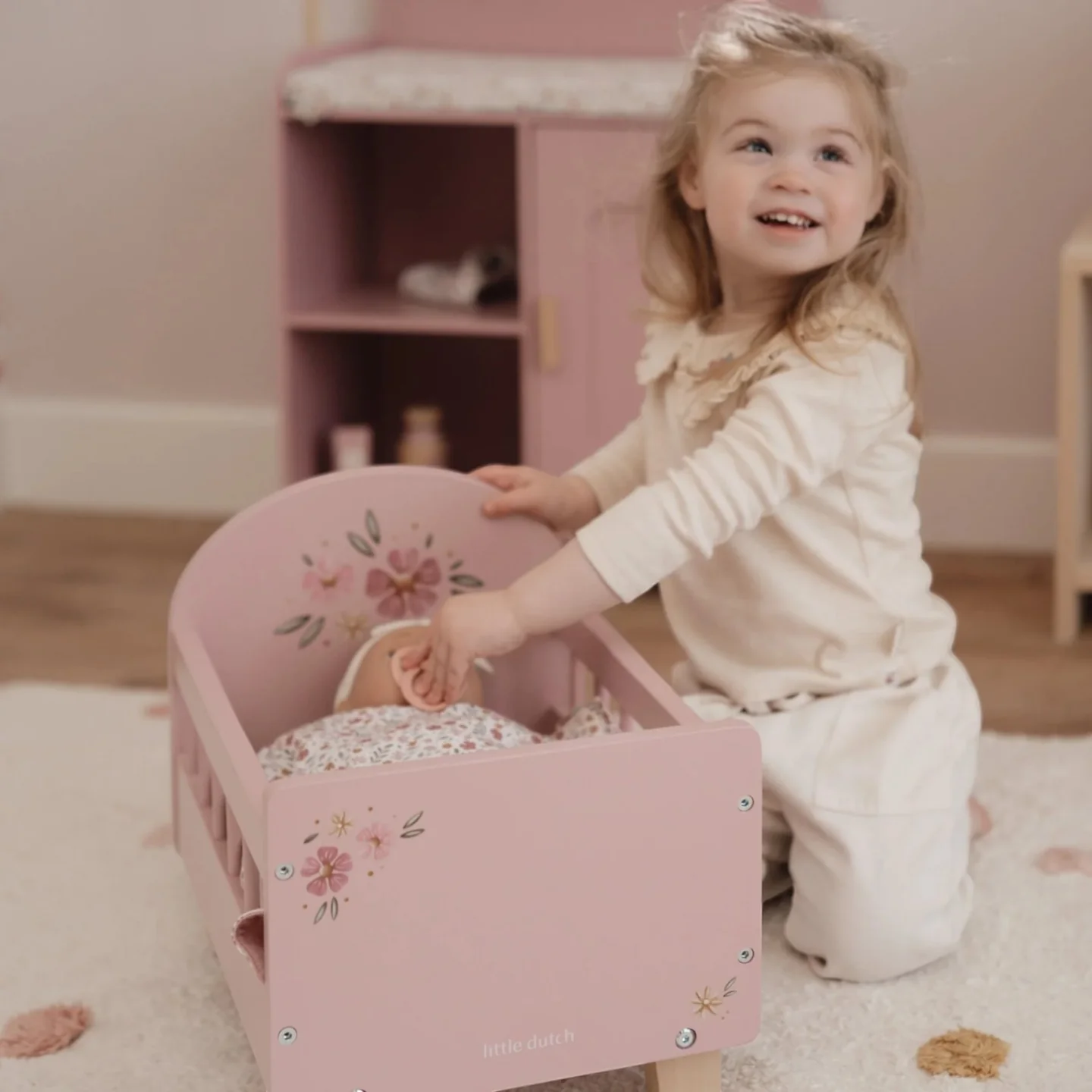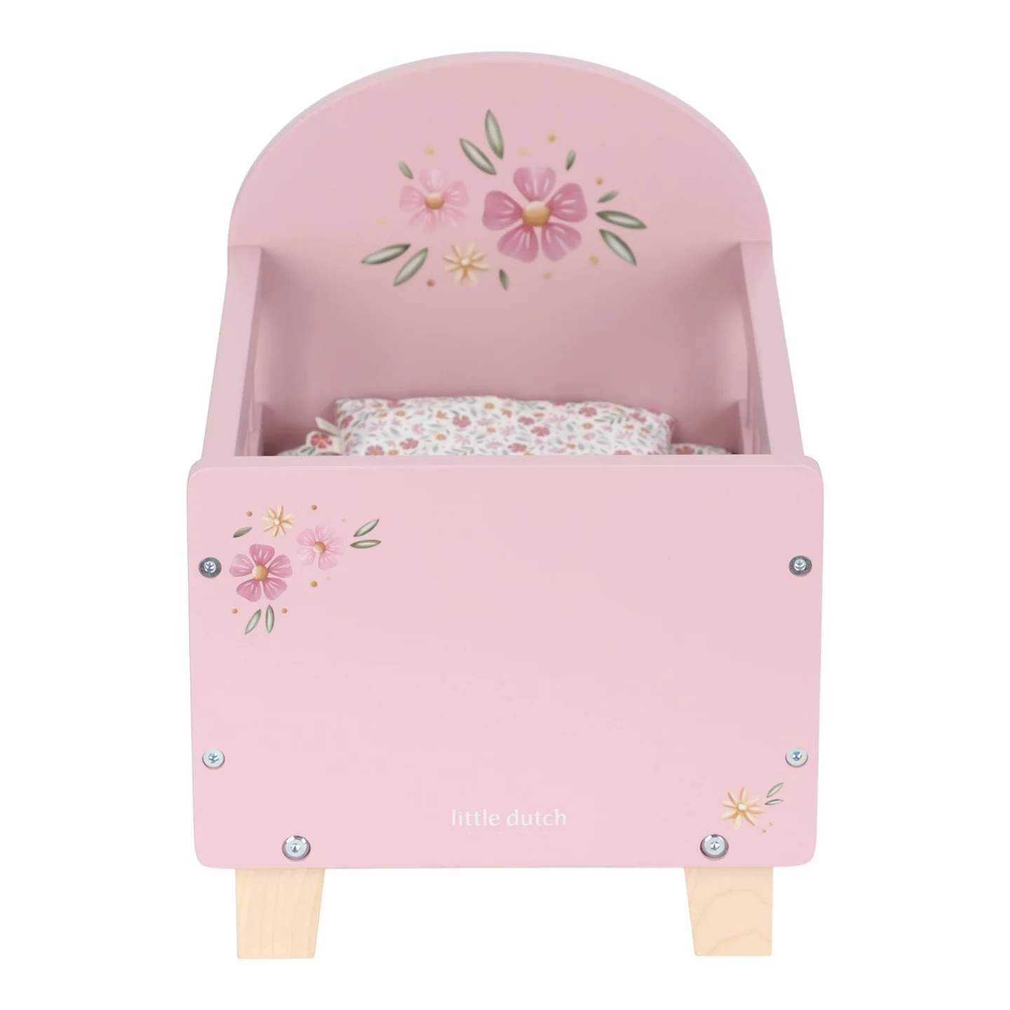 Είναι κατασκευασμένο από ανθεκτικό ξύλο και για να είναι ιδιαίτερα άνετο για τα κουκλάκια σας, συνοδεύεται από μαξιλάρι, κουβερτούλα και στρωματάκι με υπέροχο φλοράλ σχέδιο.