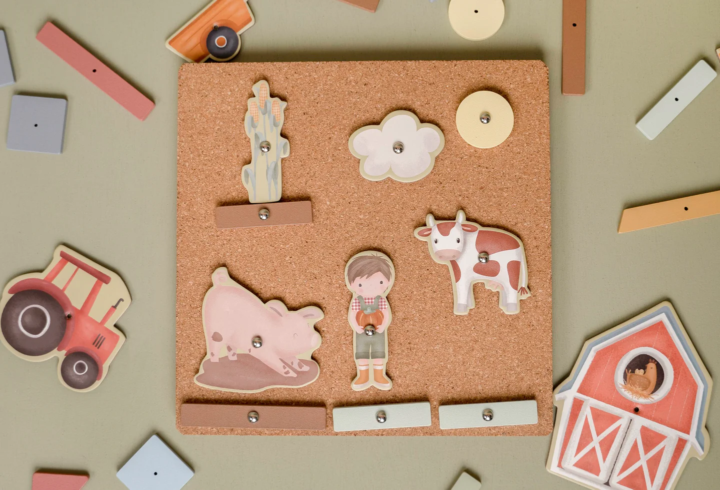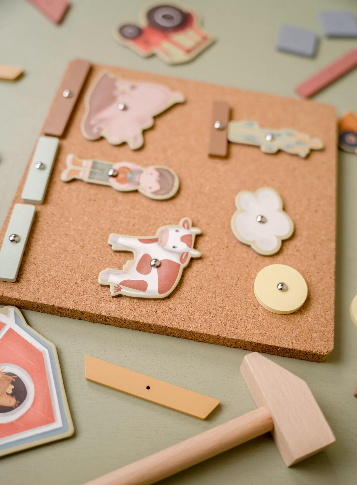 Το σετ περιλαμβάνει σφυράκι, πασσαλάκια καθώς και έναν συνδυασμό ξύλινων γεωμετρικών σχημάτων και εικονογραφημένων φιγούρων από χαρτόνι υψηλής ποιότητας. Τα παιδιά μπορούν να αφήσουν τη φαντασία τους ελεύθερη και να δημιουργήσουν τις πιο όμορφες φανταστικές σκηνές.