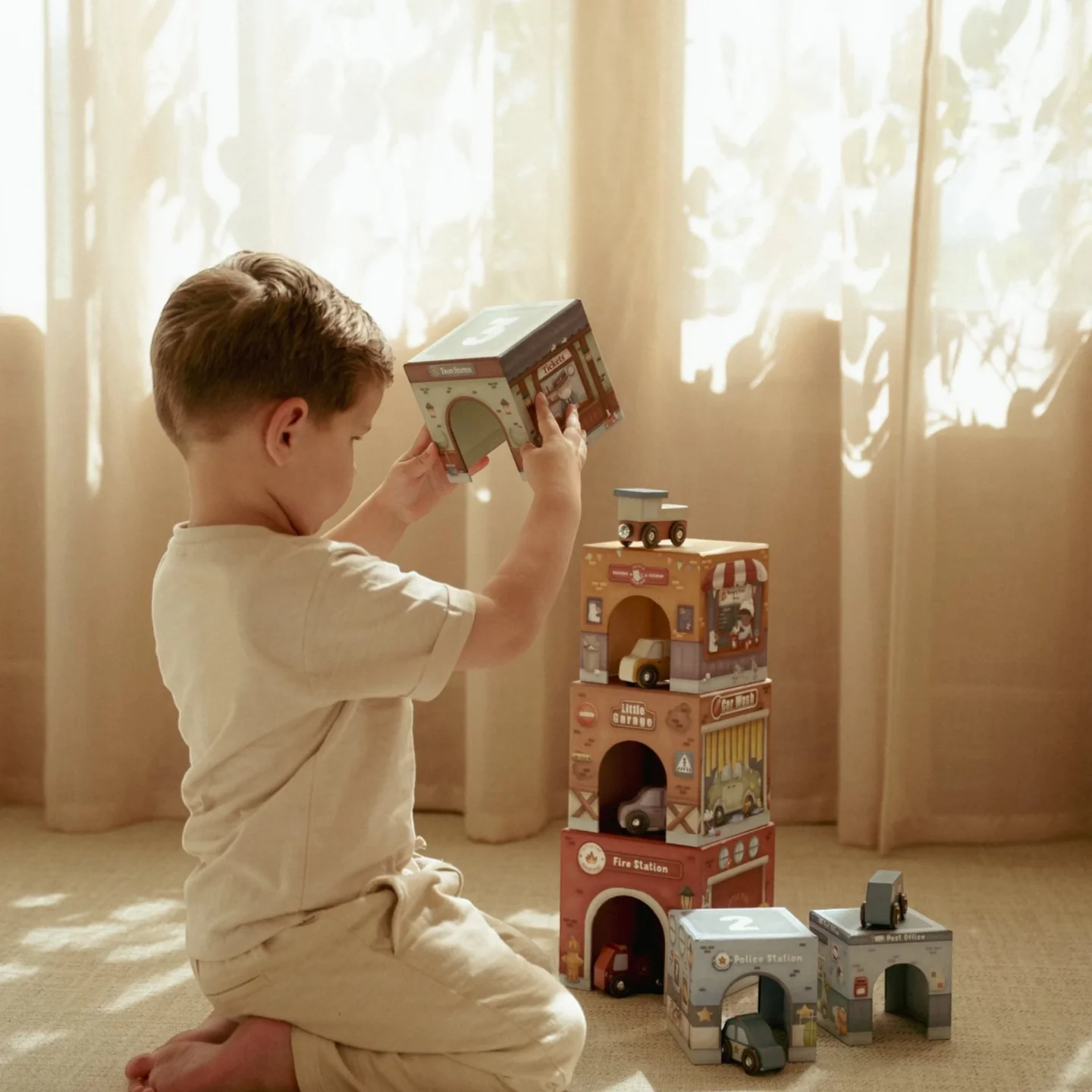 - Περιλαμβάνει 6 κύβους από ανθεκτικό χαρτόνι με πιστοποίηση FSC και ξύλινα αυτοκινητάκια.
