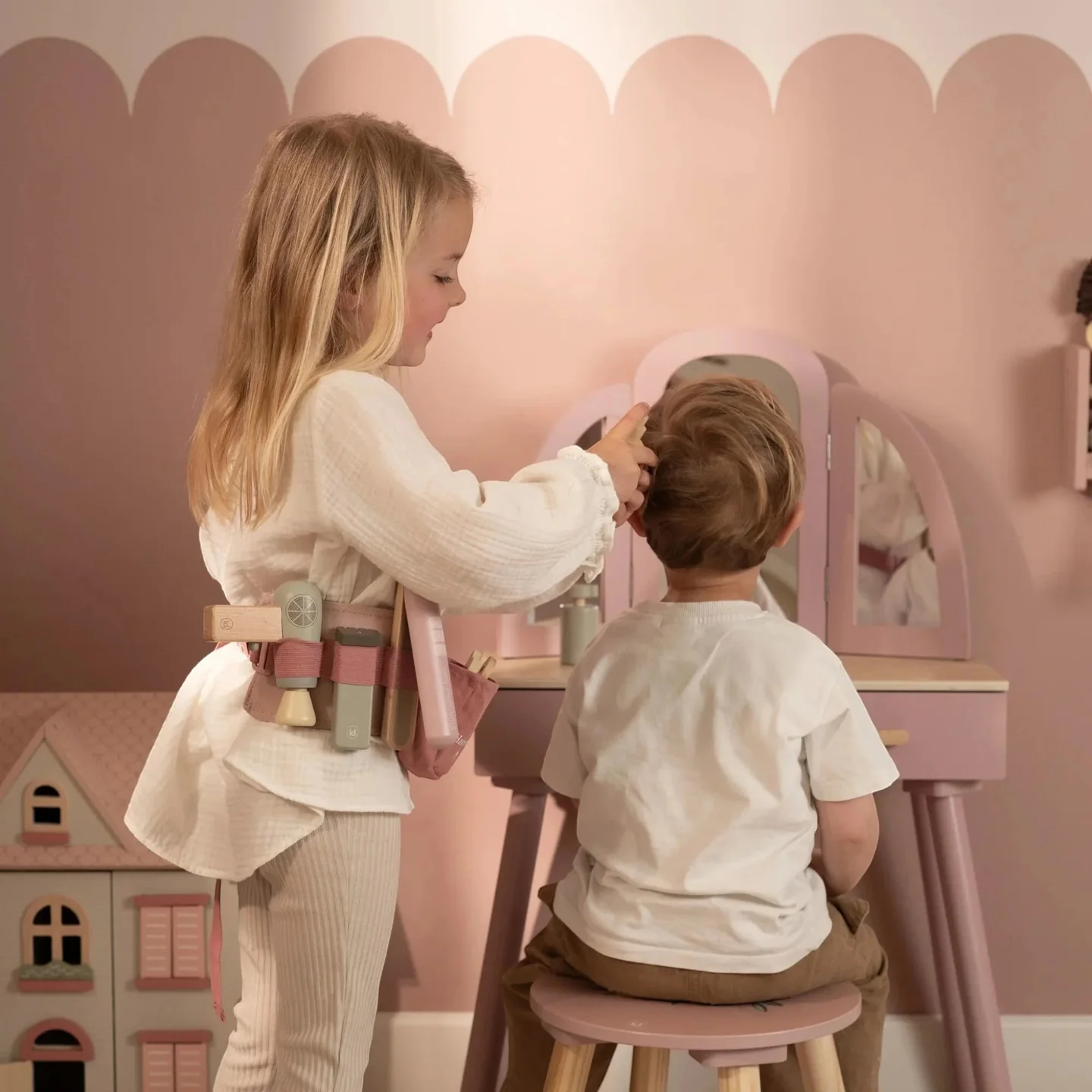 Η ρυθμιζόμενη ροζ ζώνη μέσης περιέχει πλήθος αξεσουάρ παιχνιδιού, όπως ξύλινο ψαλίδι, πιστολάκι, ισιωτική, κουρευτική μηχανή, βούρτσα, σαμπουάν, λακ και καθρέφτη.