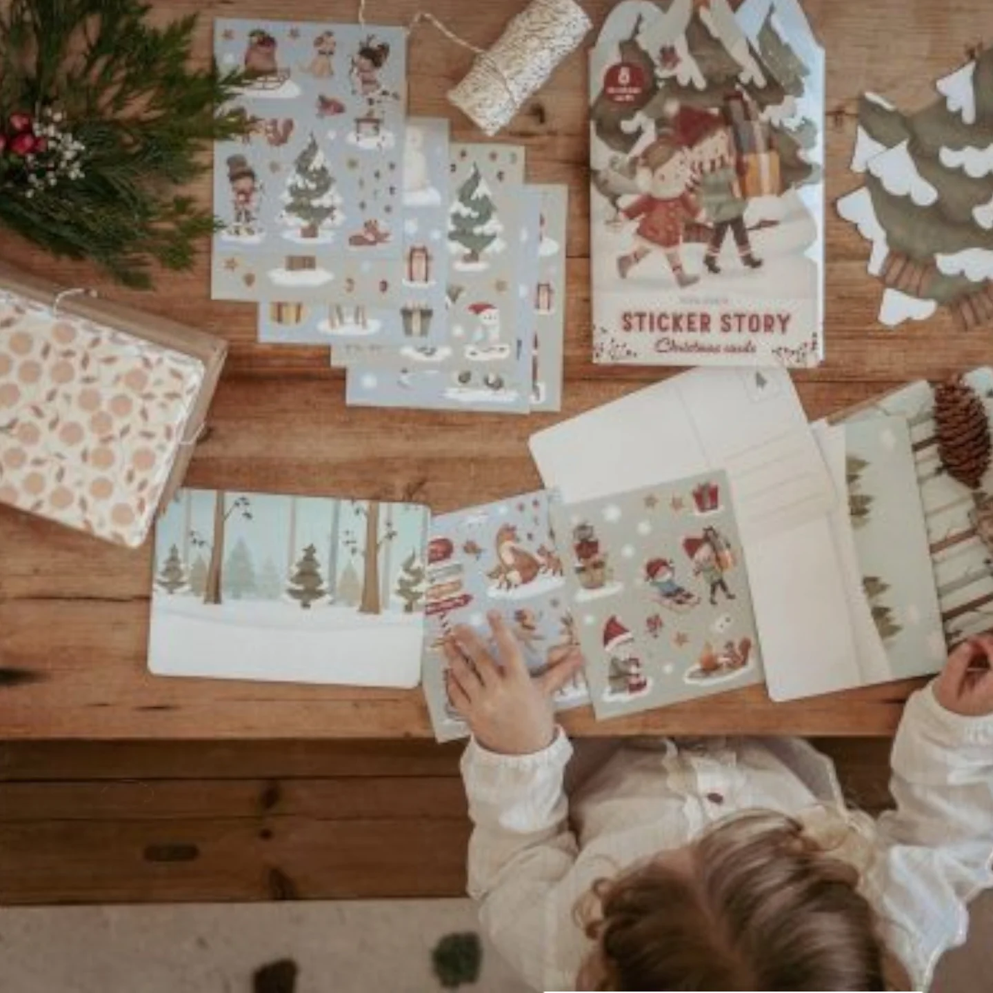 Με χαρακτήρες όπως ο Άγιος Βασίλης, χιονάνθρωποι, τάρανδοι και πολύχρωμα δώρα, τα παιδιά μπορούν να μεταμορφώσουν απλές κάρτες σε χαρούμενες, προσωπικές σκηνές. Τα αυτοκόλλητα συνδυάζονται εύκολα με τις καρτ-ποστάλ για να δημιουργηθούν αληθινά χειμωνιάτικα έργα τέχνης.